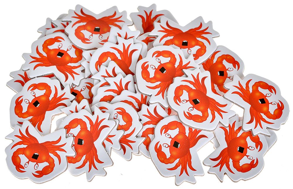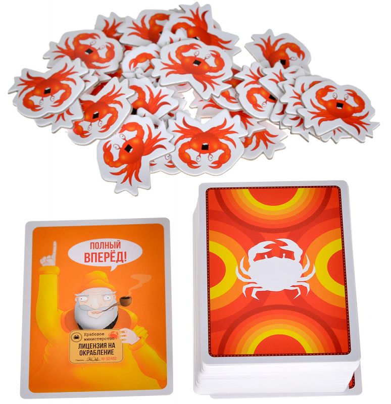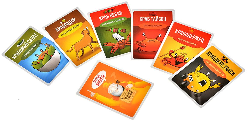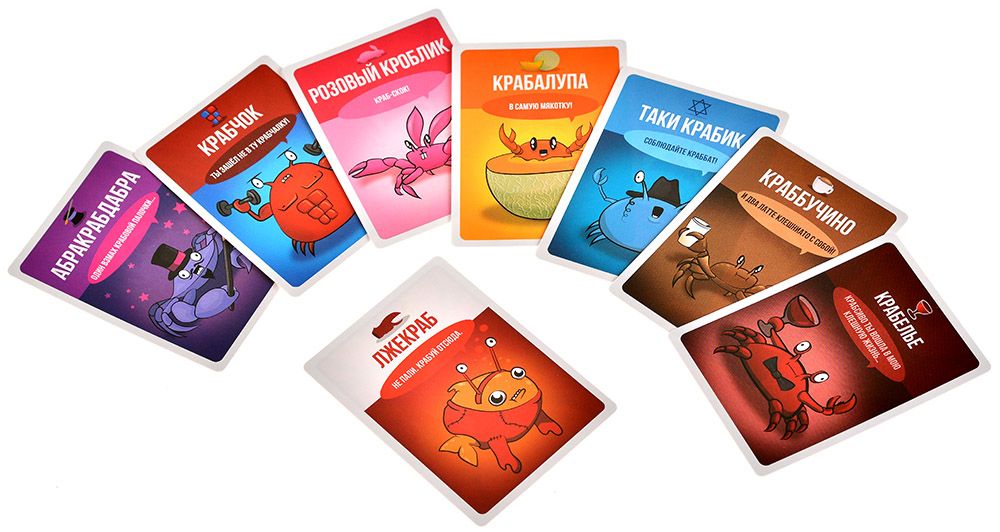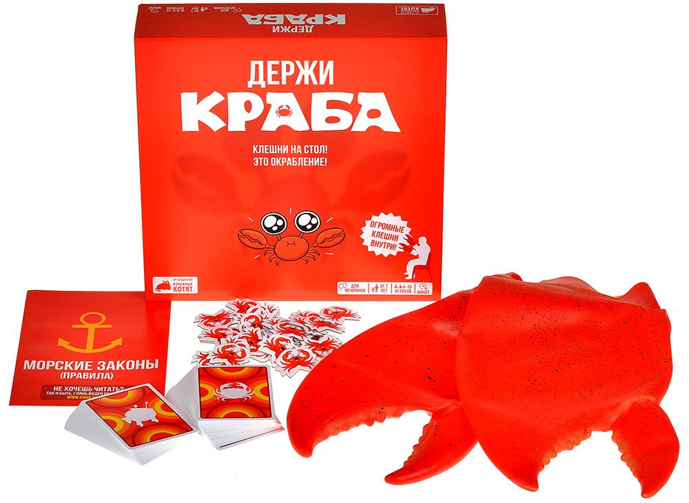 Настольная игра "Держи краба" - забавная игра от создателей нашумевшей и интересной игры "Взрывные котята". Здесь вы возьмёте на себя роль моряков, которые ловят крабов. Но вас слишком много, и крабов на всех не хватит. Разделитесь на команды по 2 или 3 человека и придумайте тайный знак. А далее, обмениваясь картами со всеми игроками, постарайтесь собрать у себя на руке 4 одинаковые. Подайте сигнал своему соратнику. Если его никто не перехватил, то вы получаете краба. Ну а если вас поймали, то ваш заветный краб уходит противнику. Для забавности в комплекте идут клешни краба. Кто же больше наберёт крабов, тот и победит.