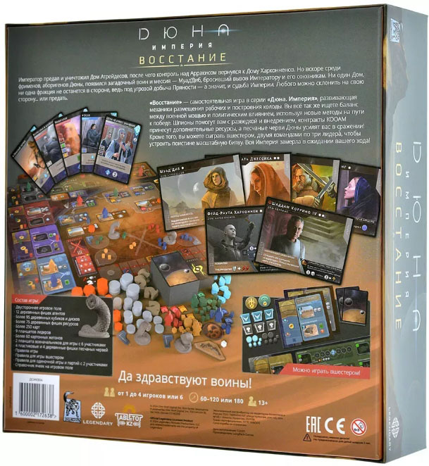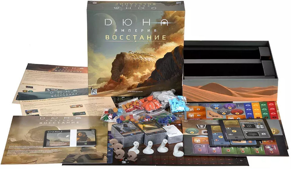Война за Арракис не утихает. В конфликт, развернувшийся за самый важный ресурс галактики, пряность, вступают новые стороны…. «Восстание» - обновленная версия хитовой настольной стратегии «Дюна. Империя». Игровой процесс остался без изменений. Что и в оригинальной игре, основа игрового процесса миплплейсмент с элементом колодостроя. Отправляйте своих рабочих в локации на выполнение миссий, грамотно распоряжайтесь своими ресурсами, сражайтесь в постоянных конфликтах и продвигайте союзы с различными фракциями. Но что же изменилось? Было переработано игровое поле, особенно Лансраад. Так, например, Ментат был убран из игры, а в Высший совет можно вступить несколько раз, чтобы навсегда повысить убеждение. Вода становится более ценным ресурсом, нежели раньше, а еще в конфликтах себе на помощь можно призывать песчаных червей. Также с переработанным полем в игру добавились новые карты рынка с мощными эффектами. Но, пожалуй, самыми интересными нововведениями стали шпионы, которых можно расположить на наблюдательные пункты, и контракты, за выполнения которых вы получите ресурсы. Разработчики «Восстания» удачно обновили полюбившийся многим игровой процесс, добавив в него новые фишки, так что если за вашими плечами множество партий в классическую «Дюну», в этой версии вы почувствуете себя как в первый раз!