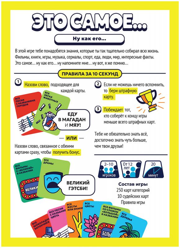 Чем хороши игры на эрудицию? Они позволяют собрать за игровым столом абсолютно разных людей, вне зависимости от их пола, возраста и интересов, и при этом гарантировать им веселое времяпровождение! «Это самое…» - новая игра, которая проверит вашу эрудицию, ведь вам то и дело придется вспоминать разнообразные факты, которые вы непонятно где узнали, и они пригодились вам только сейчас! Откройте две карточки с вопросами. Первая, например, будет «Маскот бренда», а вторая « Зубастое животное». Вы, конечно, можете ответить на каждый по отдельности «Робот Андроид» и «Акула», но вот если бы вы ответили одновременно на оба вопроса словом «Крокодил», то получили бонус! Да, это может быть далеко непростой задачкой, но оно того стоит! А вот если же у вас вовсе не получится ответить, то вы получите штрафную карточку. Игрок, набравший меньше всего штрафов в конце игры – победитель!