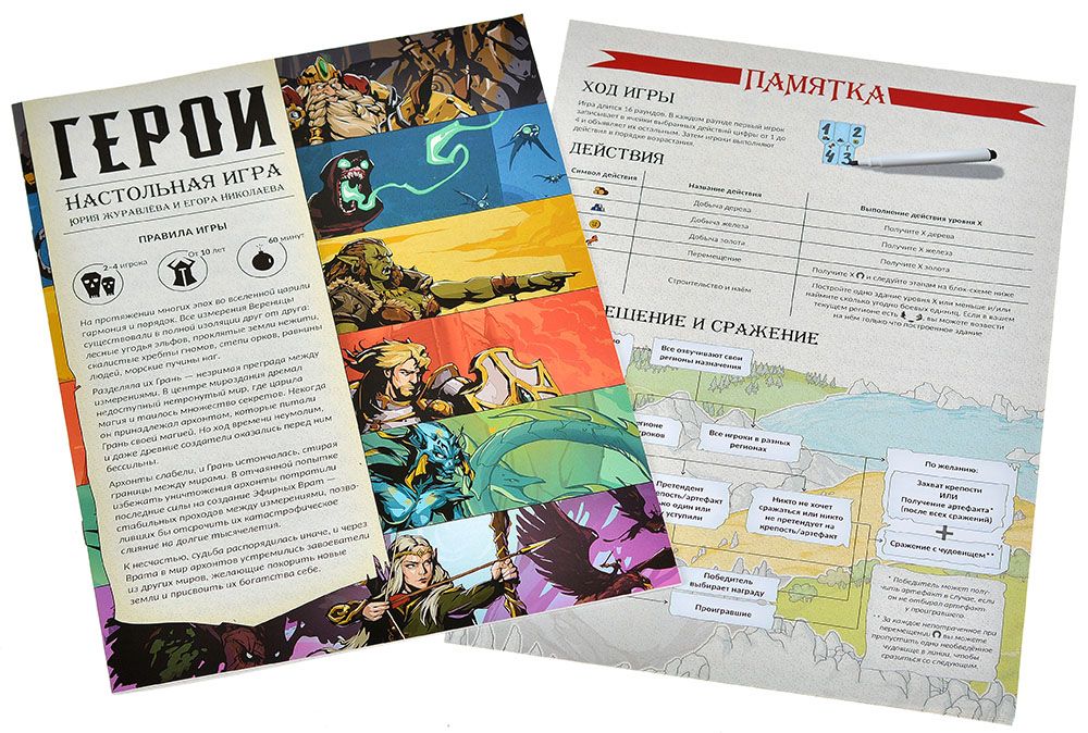 "Герои" - уникальная настольная игра, представляющая из себя полноценную масштабную стратегию в компактном формате, для игры в которую Вам понадобится только планшет и маркер, ничего лишнего! Выбирайте одну из 6 уникальных рас и приведите ее к триумфу. Кто победит в ожесточенном противостоянии: нежить, люди, эльфы, а может орки? Простые правила, напряженный игровой процесс и вариативность - вот главные особенности игры. Окунитесь в атмосферу старых фэнтези игр вместе с настольной игрой "Герои"!