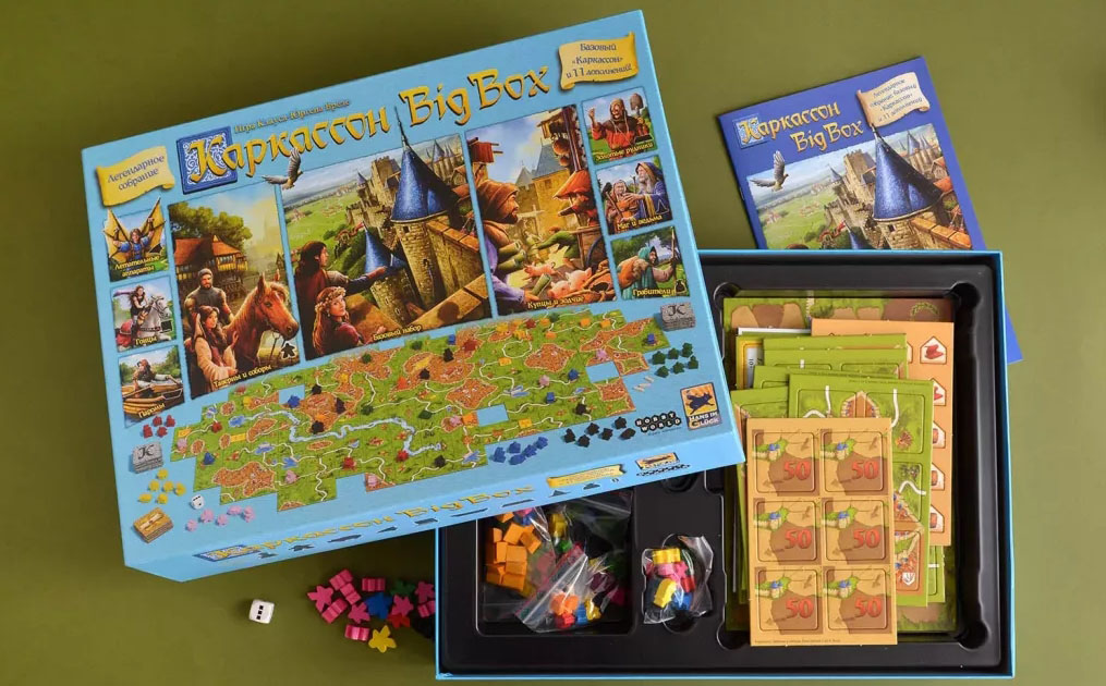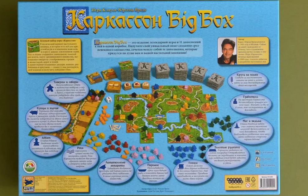 «Каркассон: Big Box» - это новое издание всеми любимой и известной игры "Каркассон". Базовая версия вышла в 2000 году, а уже в 2001 году получила премию "Игра года". И с тех пор она покорила мир настольных игр. И вот очередное уникальное продолжение, которое включает в себя базовую игру, а также целых 11 дополнений. Они все совместимы друг с другом, но можно играть и по отдельности с каждым допом.