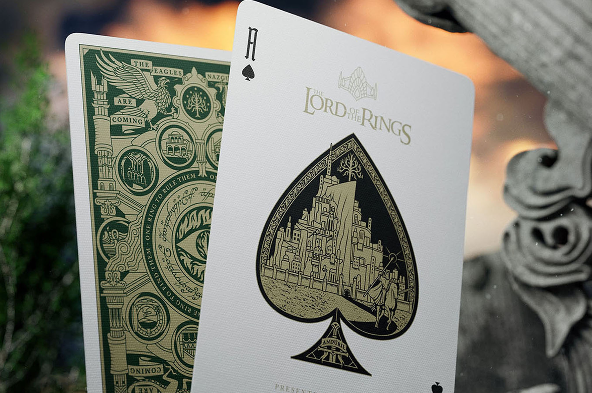 Theory11 выпустили уникальную колоду, которая гарантированно притянет взгляд фанатов Толкиена, ведь эта колода основывается на вселенной Властелина колец. На картах стильные иллюстрации с героями, пропитанные духом фэнтези. Качество карт, как обычно по традиции Theory11 на высоте. Сама коробка от карт стильно оформлена, с золотым оттиском. Это делает колоду the Lord of the Rings настоящим сокровищем, которое хотят заполучить как кардистри, так и коллекционеры.