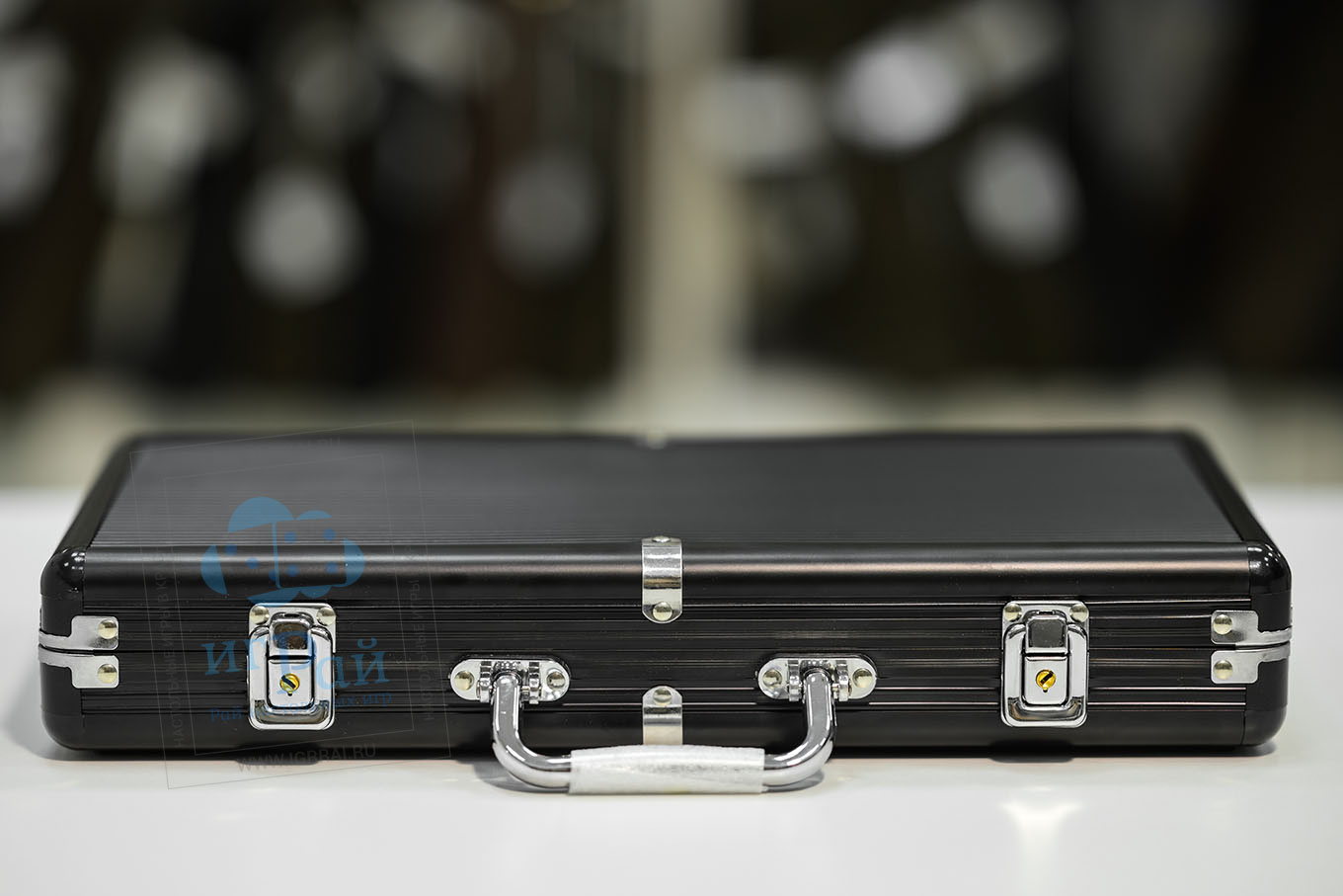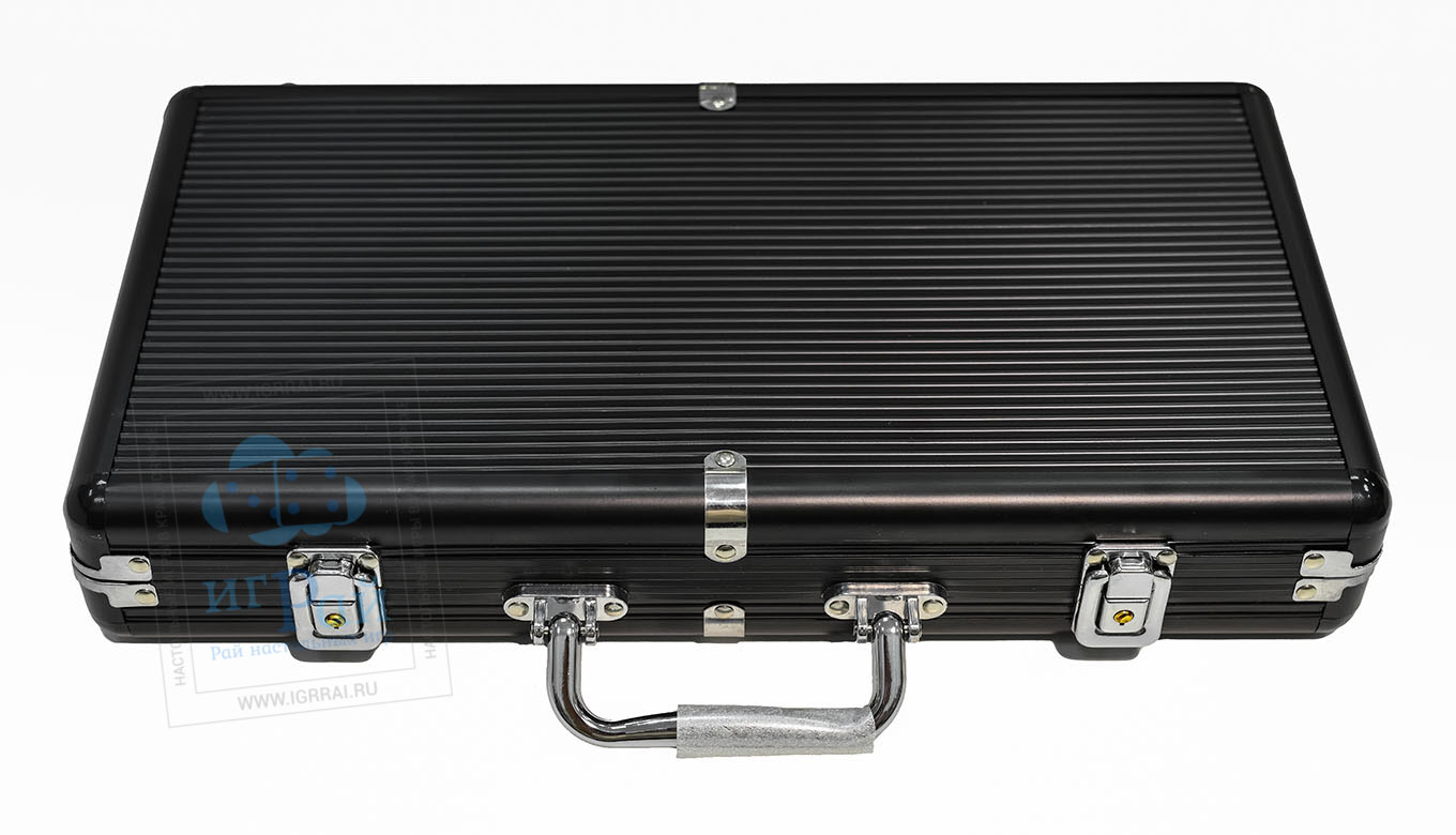 Качественный металлический кейс для покера на 300 фишек. Внутри находится удобный органайзер для карт и фишек.