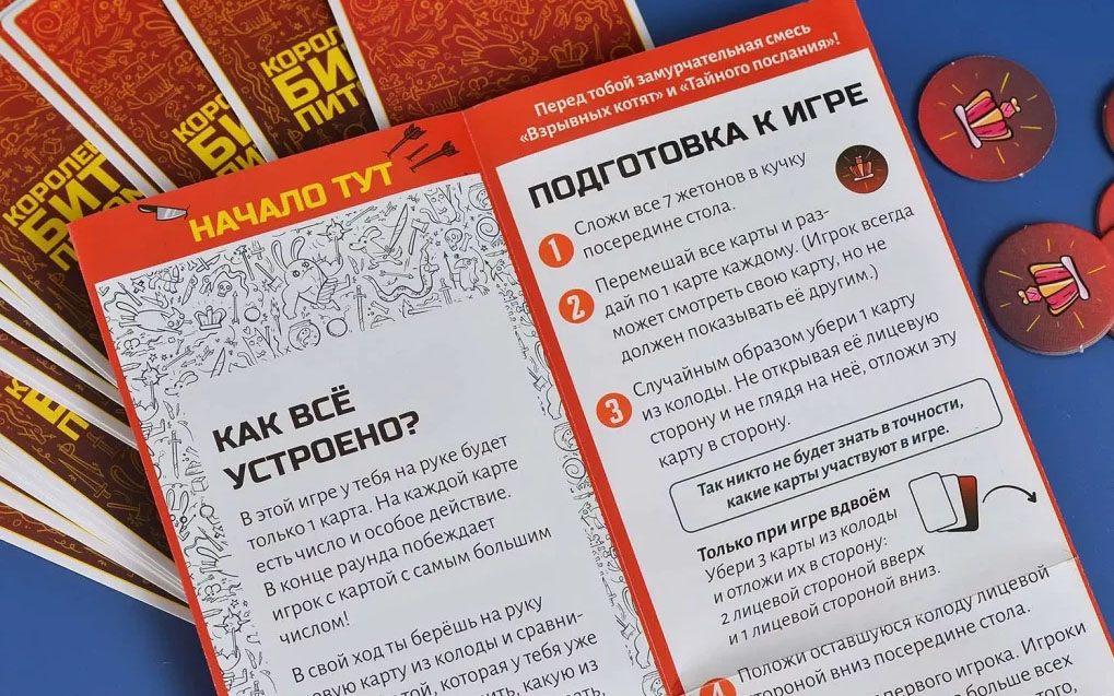 Каждому игроку раздайте по одной карте и одну сбросьте, а оставшиеся карты положите в центре стола лицом вниз. Выберете первого игрока. И погнали.