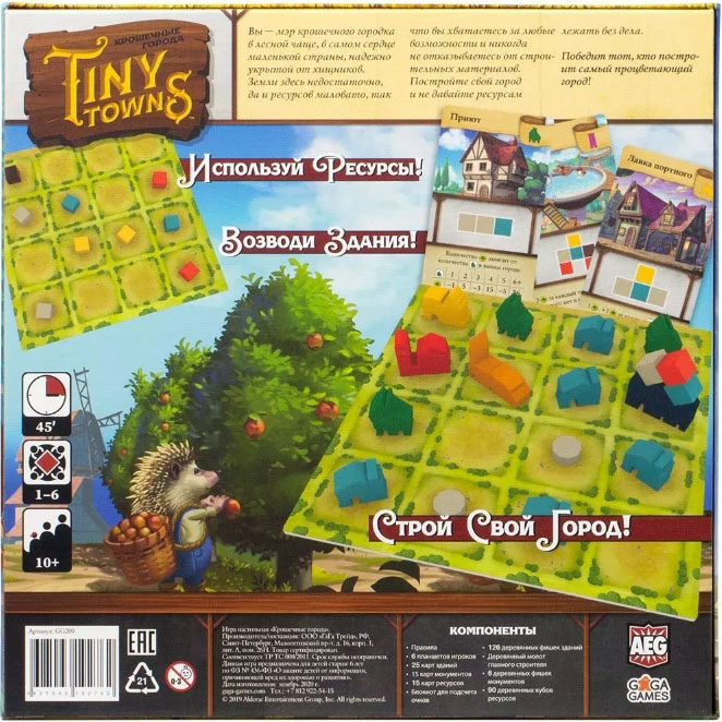 Мэром быть очень как непросто! Особенно, если у вас нет ни города, ни горы ресурсов. Есть разве что трудолюбивые жители, мечтающие о счастливом будущем. Именно вам и предстоит взять на себя роль мэра в настольной игре «Крошечные города»! «Крошечные города» - милая и простая семейная стратегия, в которой игрокам предстоит возвести свой город. Крошечный город! Ведь на вашем планшете всего 16 мест для различных строений, поэтому игрокам необходимо тщательно продумывать, какие здания они хотят возвести. Чтобы построить домик, вам необходимо разложить на планшете соответствующие ресурсы, требуемые на одной из карт. С каждым ходом строительство новых зданий будет все сложнее, ведь место на планшете становится все меньше и меньше! Каждая партия в «Крошечные города» будет напряженной, ведь кроме ограниченной территории, на игроков накладывается ограничение в выборе ресурсов. Будьте готовы выкручиваться из непростых ситуаций! «Крошечные города», без сомнений, является одной из лучших семейных стратегий, которая придется по нраву как новичкам, так и бывалым настольщикам благодаря кризисности и необходимости адаптировать игровую стратегию!