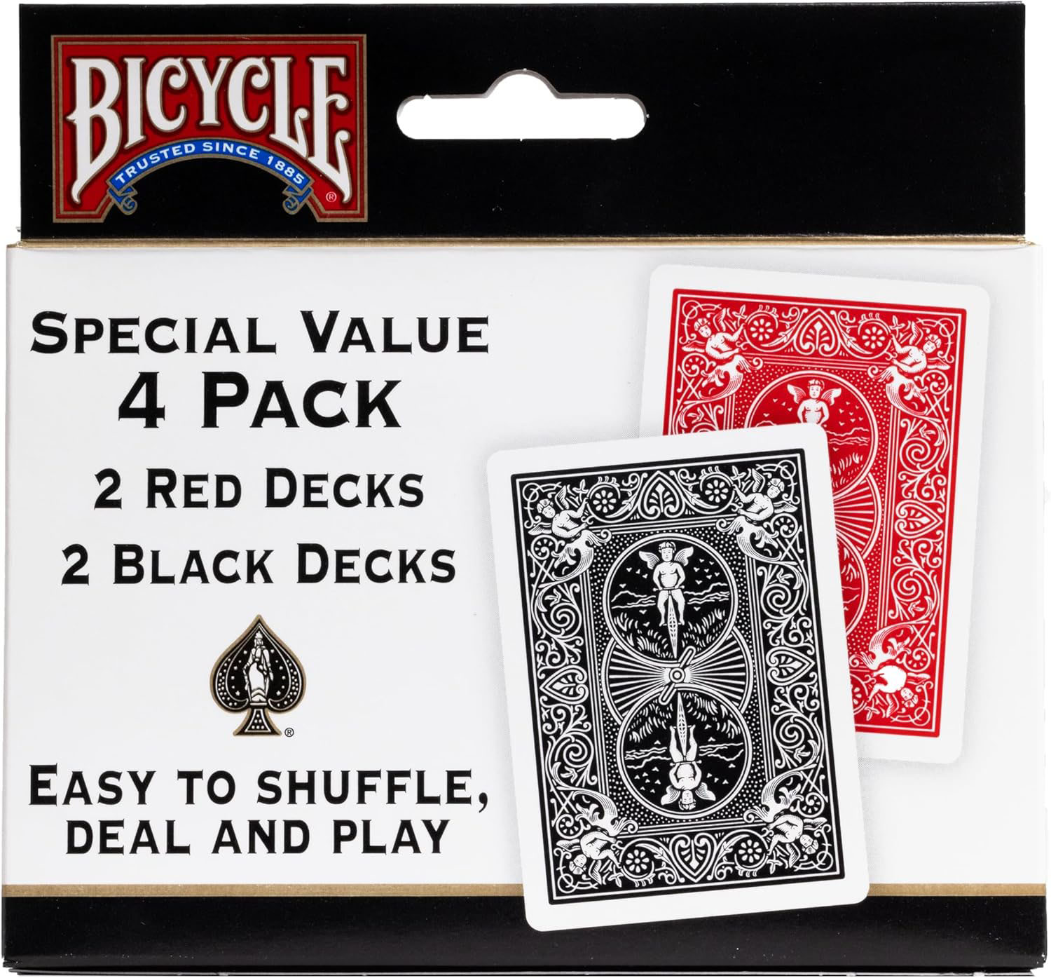 Часто приходится покупать новые колоды на замену старым? Присмотритесь к варианту покупки сразу целого набора колод! Компания Bicycle выпускает полноценные паки на любой вкус, и вот перед Вами набор из 4 колод, в составе которого по 2 колоды Standard черного и 2 колоды Standard красного цвета! Колоды выполнены по высочайшим стандартам качества Bicycle - плотная бумага, приятное пластиковые покрытие. Сами карты легко шафлятся, играть ими сплошное удовольствие!