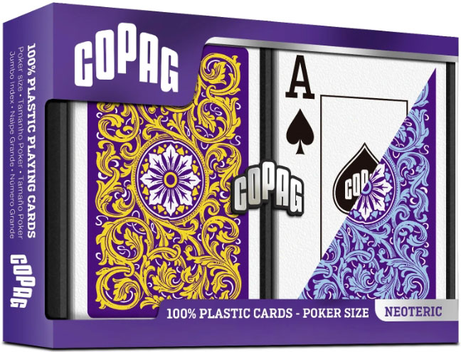 Премиальный набор из двух колод покерных карт из 100% пластика от Copag. Увеличенный индекс, покерный размер и практически неразрушимый ПВХ-пластик дают лучшие ощущения от игры данными колодами. Приятно держать в руках. Отличная прочность и удобства при использовании сделают ваши игры приятными. Выдержать не мало игр, не боятся воды, а для хранения в комплекте идёт удобный футляр. Яркий дизайн рубашек сделает их заметными на столе и добавит красок в вашу игру.