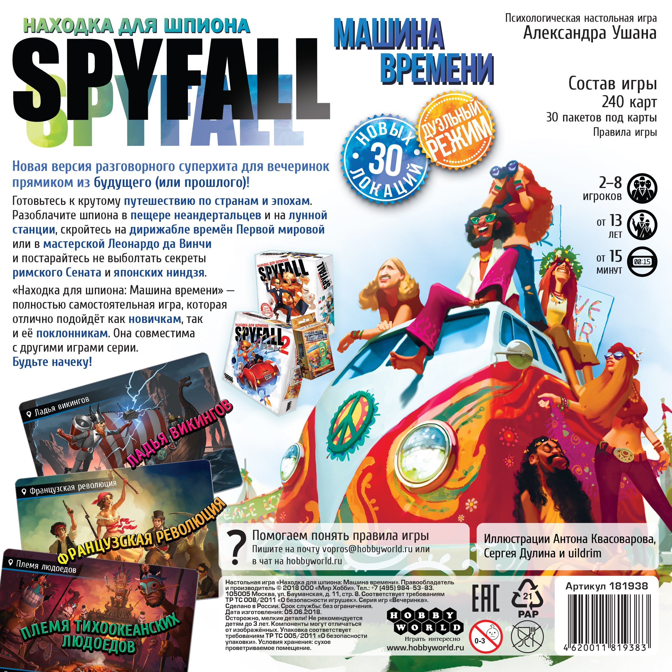 Новая версия разговорного суперхита для вечеринок прямиком из будущего (или прошлого)! Готовьтесь к крутому путешествию по странам и эпохам. Разоблачите шпиона в пещере неандертальцев и на лунной станции, скройтесь на дирижабле времён Первой мировой или в мастерской Леонардо да Винчи и постарайтесь не выболтать секреты римского Сената и японских ниндзя.
