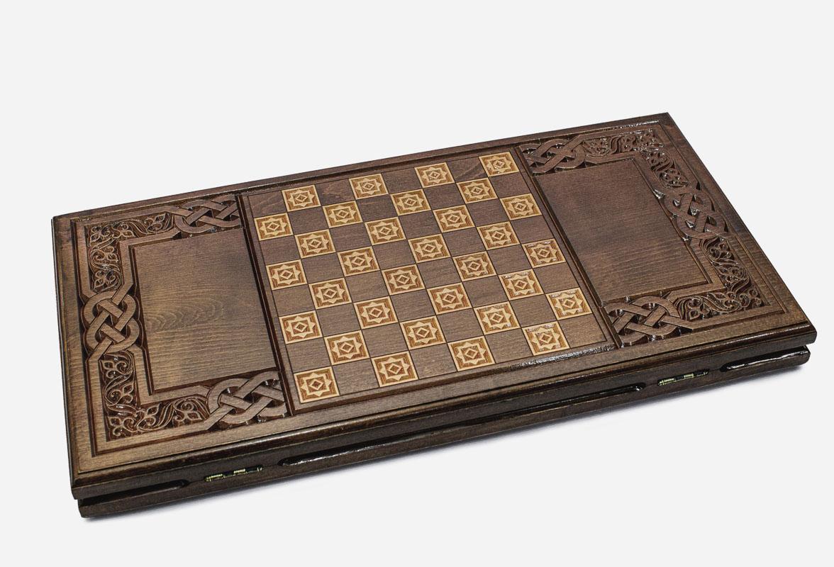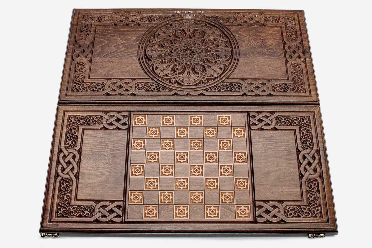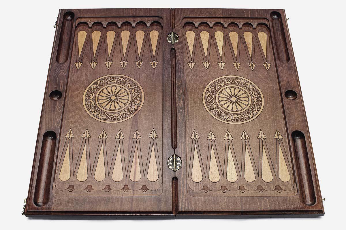Эти нарды - настоящее произведение искусства! Качественная ручная работа, стильный дизай, в основе которого простые узоры. Снаружи - резной, а внутри - инкрустация. Также внутри эти нарды украшены интересными бронзовыми петлями. К нардам в подарок идет удобный чехол для перноски и хранения.