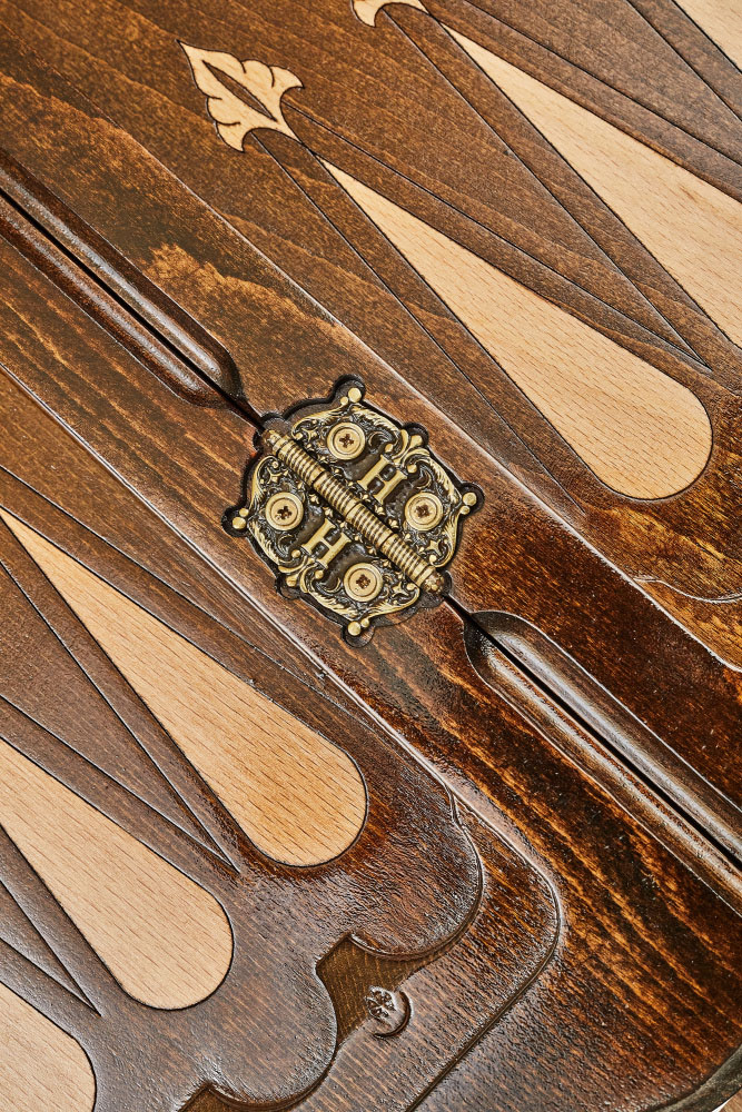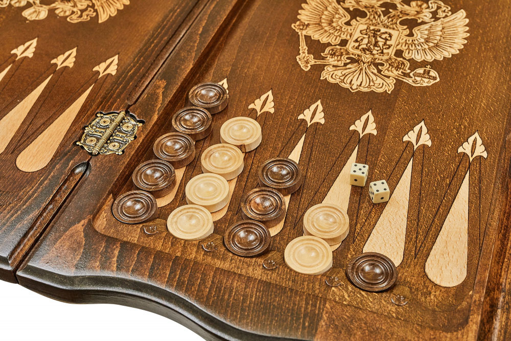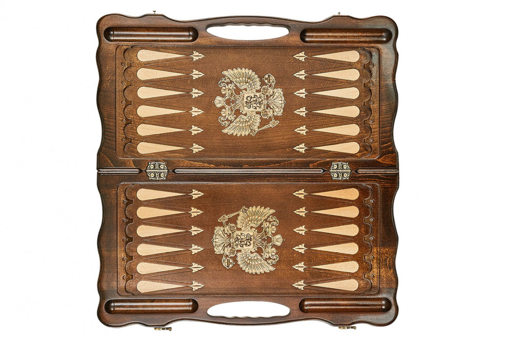 Внутри располагается бар для фишек, а поле для игры оформлено весьма сдержанно - в центре нанесено изображение герба РФ, а также имеются треугольники, подчеркивающие ячейки.