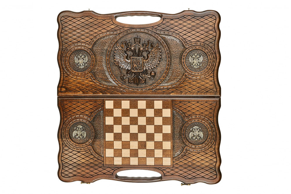 Главным украшением доски является резное изображение Герба Российской Федерации. Кроме этого на внешней стороне доски имеются бронзовые вставки, которые придают изделию еще более презентабельный вид. На обратной стороне имеется поле для игры в шашки, также украшенное с двух сторон бронзовыми вставками в виде Герба РФ. Доска выполнена из цельного массива бука. Данный материал является прочным и долговечным и имеет интересную текстуру, которая дополнительно подчеркивается лаком, защищающим дерево от механических повреждений и различных дефектов. Фурнитура выполнены из высококачественной бронзы с нанесением на нее гравировки.