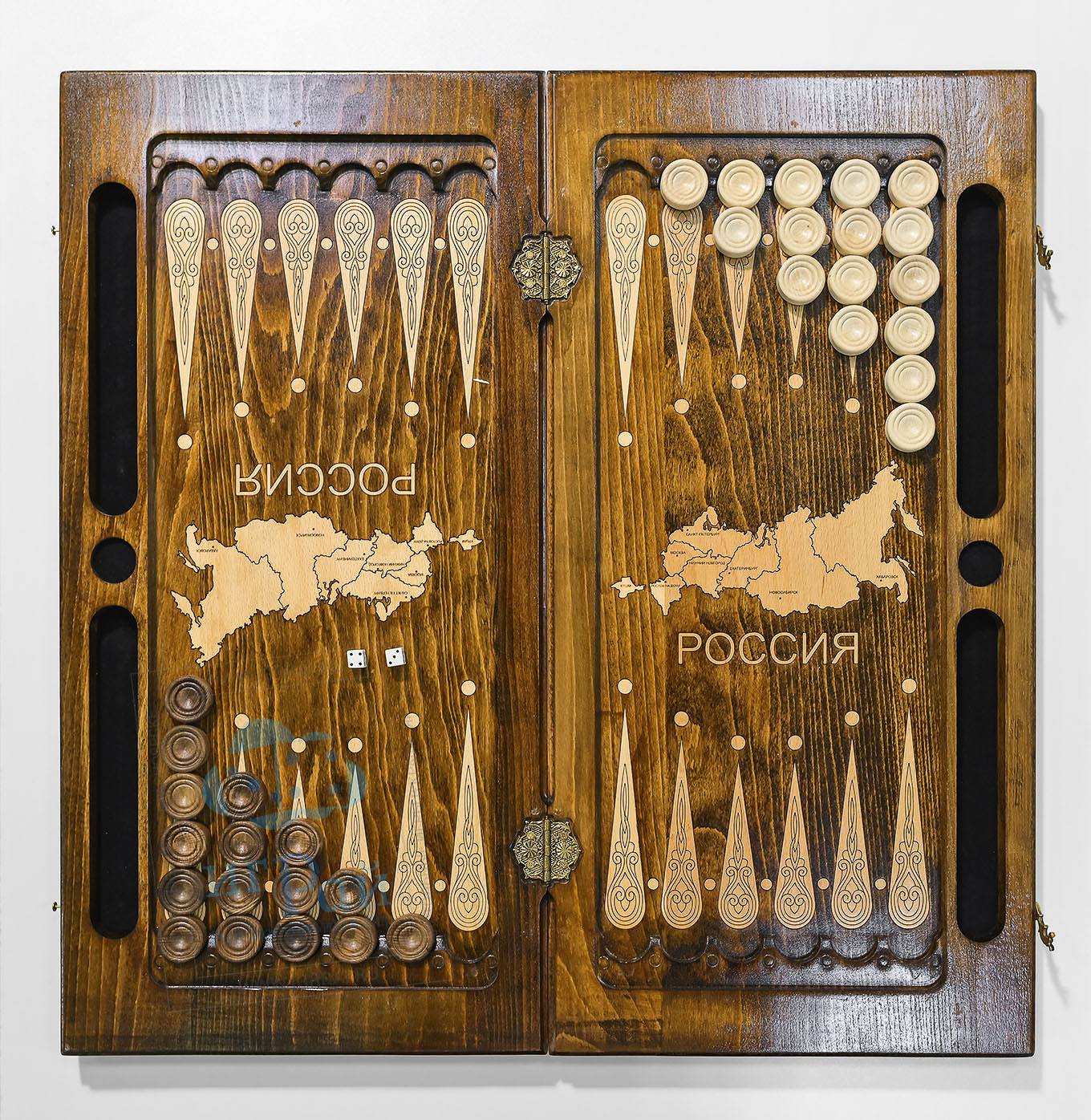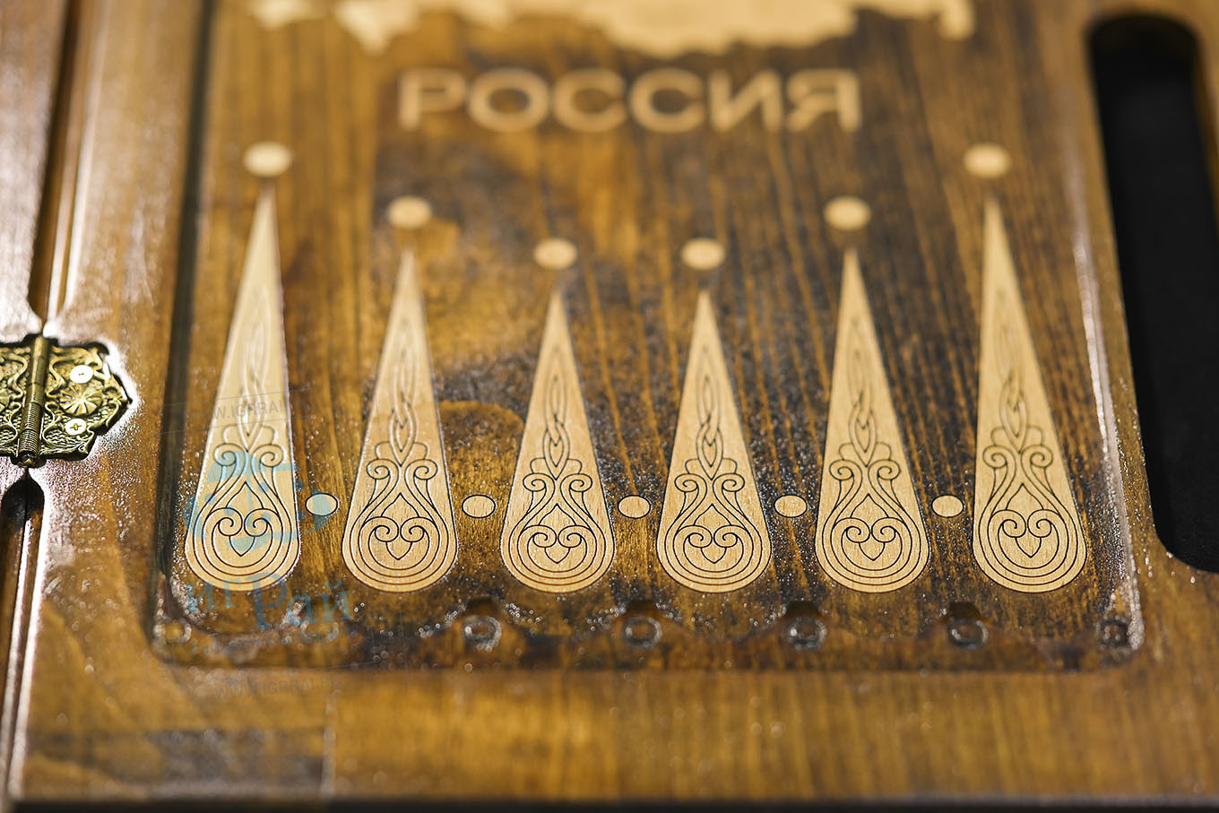 Нарды из бука ручной работы, прямо из Армении. Снаружи доска украшена гербом РФ и плетеным узором, внутри карта страны, а еще бары и фишки с подкладкой. Все это станет замечательным подарком для фаната нард!