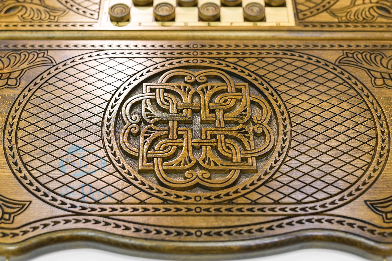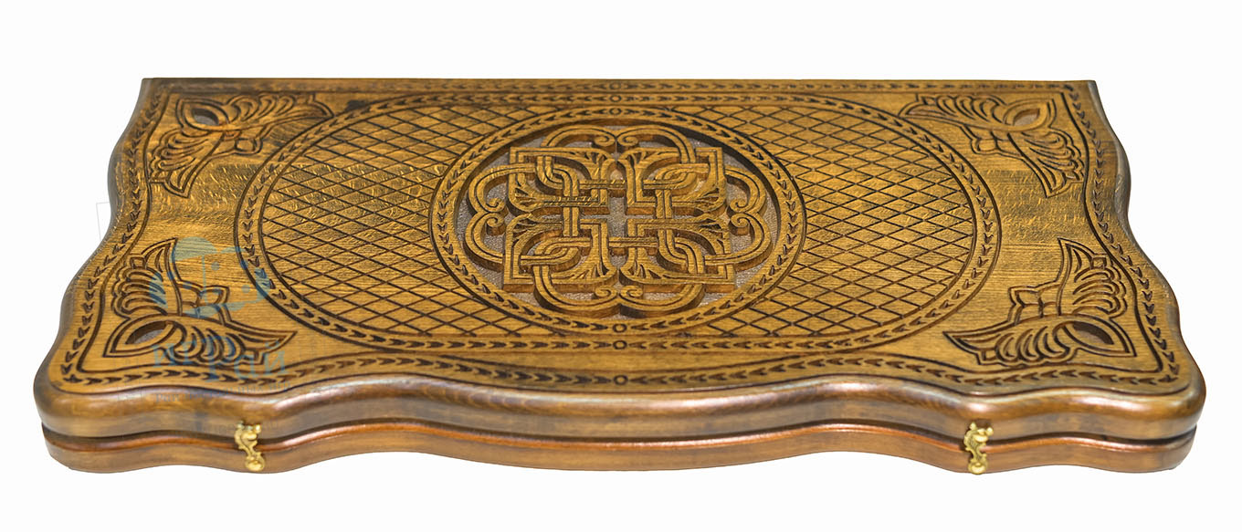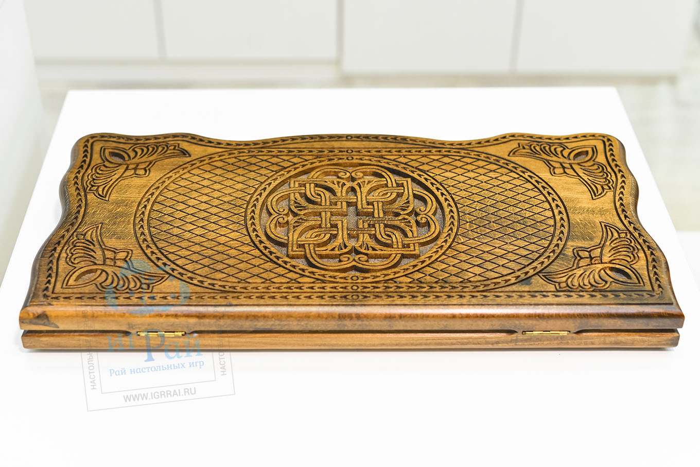 Хорошие нарды, без сомнения, являются не только игрой, но и весьма харизматичным предметом интерьера. И не удивительно, ведь солидный массив бука, покрытый темным лаком, так еще и с резным узором, наверняка цепляет взгляд. Но это еще не все, ведь если раскрыть эти нарды, они становятся еще краше. Внутри у них вставки из светлого дерева с абстрактным узором. Фишки выглядят не хуже, они имеют удобную выемку под палец, а снизу имеют подклейку. Вся эта красота поставляется в чехле для переноски и хранение.