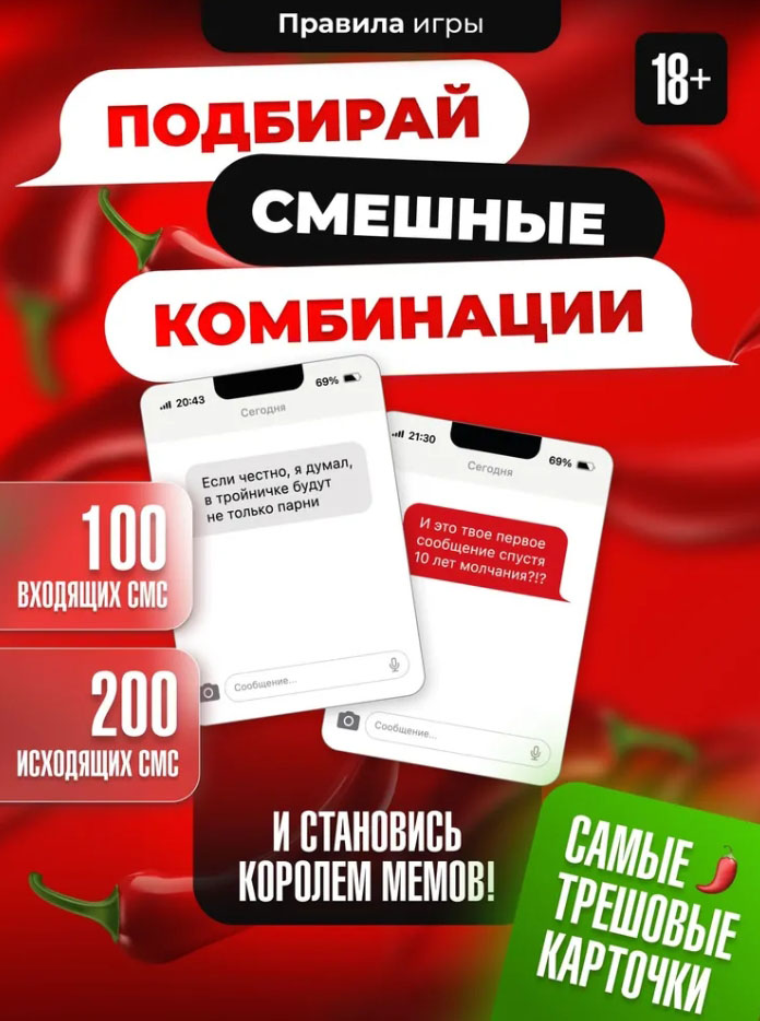 Ух, на этот раз это что-то действительно взрослое! «Неизвестный абонент» - вариация популярной игры в «мемы», только вместо мемов вы отправляете карточку с «смской»! Правила просты – на карточку с ситуация все игроки выкладывают карточки с самыми смешными ответами, что у них есть на руке. Выбранный заранее ведущий перемешивает карты с вашими ответами, после чего голосует за тот, что заставил его смеяться громче всего, и если это был ваш ответ, это победа! Но это только один раунд, рано радуетесь! Кто по итогу всех раундов был самым лучшим шутником – побеждает! Данная версия игры «Неизвестный абонент» отличается специальным набором карт, рассчитанным специально для взрослых, так что в этой коробочке будет множество пошлых и откровенных ситуаций.
