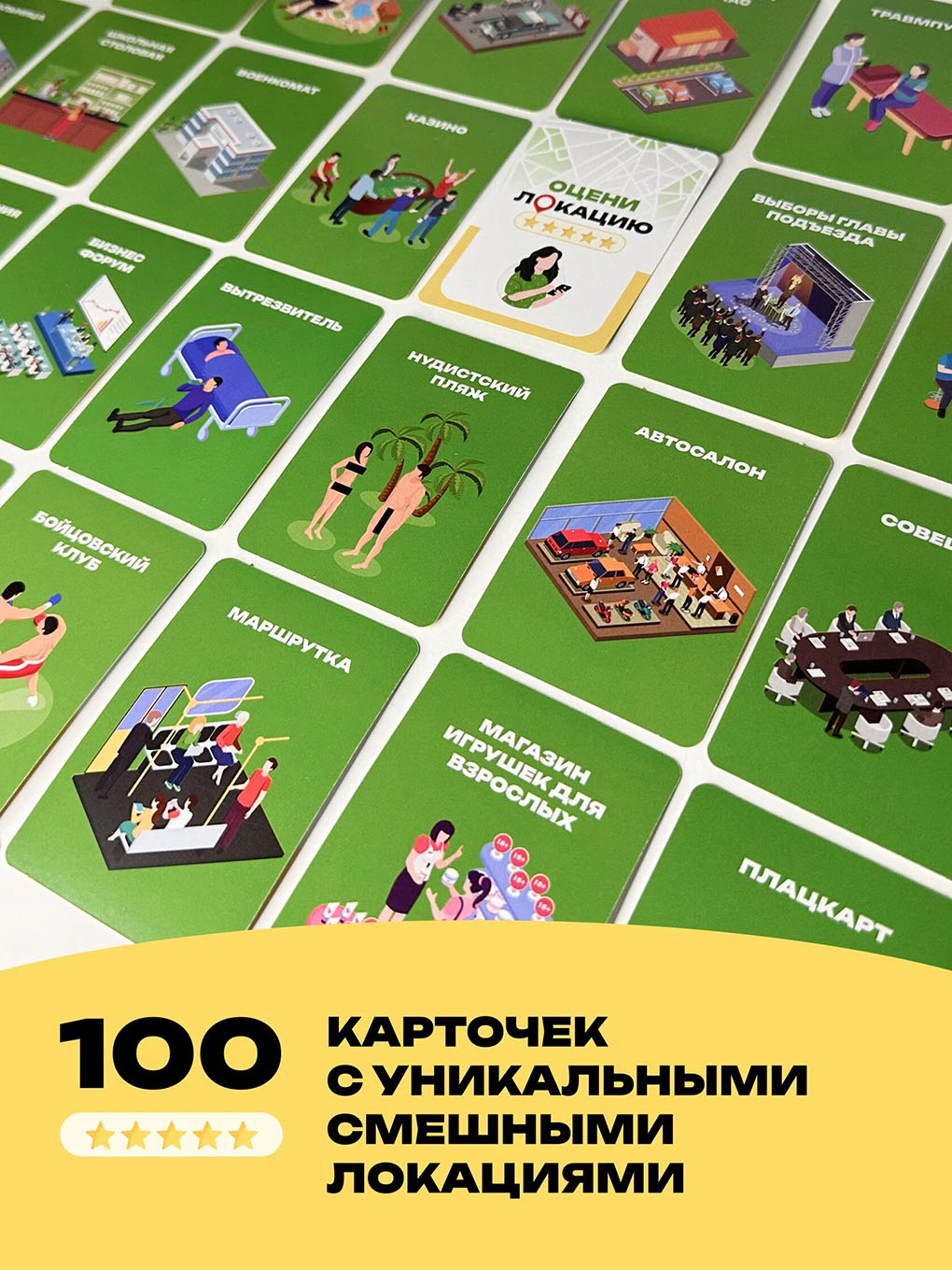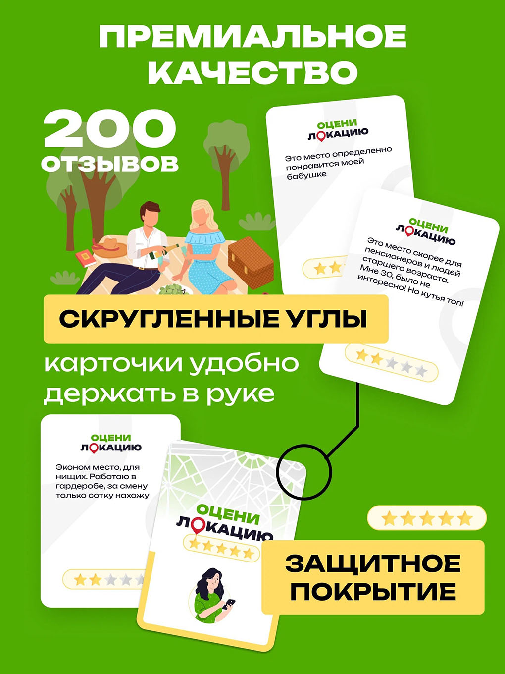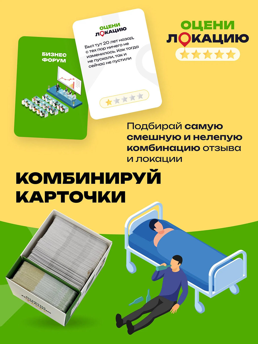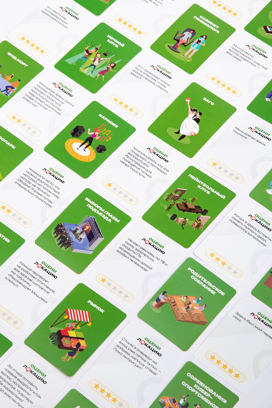 После посещений каких-либо заведений вы можете оставить отзыв о нём. Настольная игра «Оцени локацию» даст вам возможность отставить отзывы на различные локации. Посетите самые обычные и удивительные места и оставьте либо хороший отзыв, либо плохой. Отзывы есть самые разные и очень смешные.