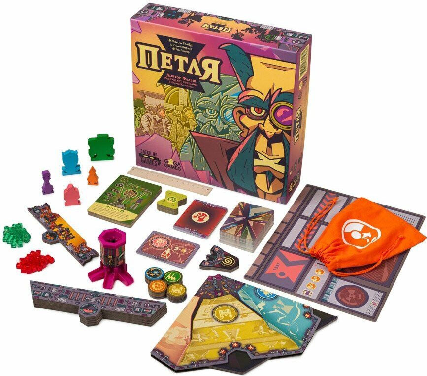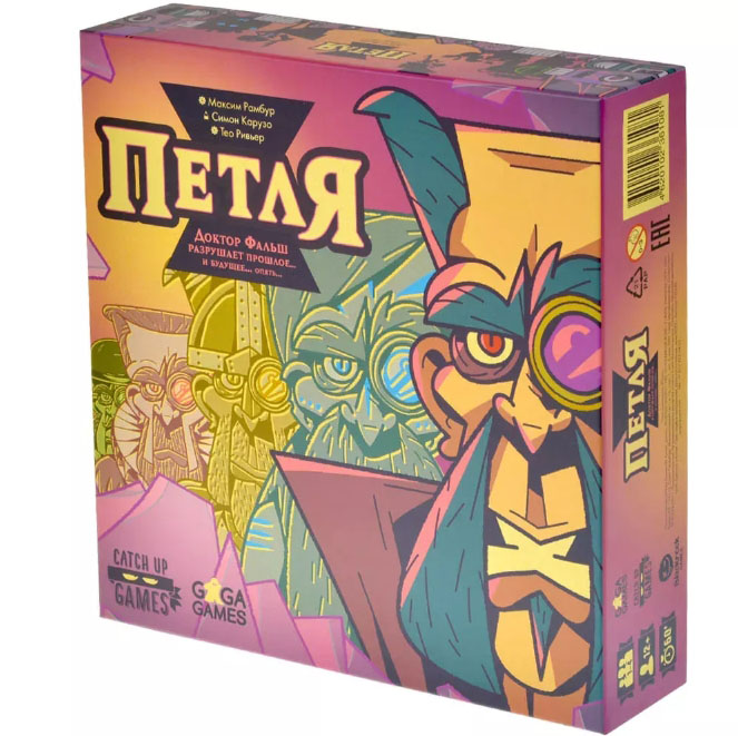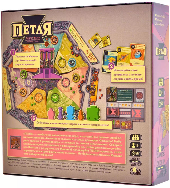 Коварный доктор Фальш славится во всем мире своим огромным интеллектом, любовью к науке и, конечно, гадким нравом. Все это в нем объединилось и создало настоящего монстра, который грозится уничтожить будущее нашего мира… А вместе с этим и его прошлое! Агенты, общий сбор! Команда спецагентов по борьбе с Фальшем весьма разношерстная, вам обязательно найдется местечко. Каждый из них является представителем своей временной эпохи. Вот, например, гениальный ребенок Мегаватт, пилотирует меха, а ведь он собрал его на заре индустриальной эпохи, а стильный Мистер время промышлял своими делами в эпоху возрождения. А вот с Уничтожительницей-404 осторожнее, в будущем роботы все еще плохо понимают юмор. В любом случае, скучно не будет! «Петля» - кооперативная игра, колодострой в своей основе. При этом, в ней присутствует множество необычных элементов. Например, в самом «центре» игры стоит башня, с помощью которой будут распределяться кубики по временным эпохам. Также в игре присутствует механика перемотки времени, с помощью которой вы можете дополнительный раз прокрутить комбинацию из карт. Сама игра словно сама перематывает время, ведь каждая партия будет такой же веселой и увлекательной как первая. Достигается это тем, что в игре 5 персонажей, каждый из которых со своей способностью, 4 сценария, а также несколькими уровнями сложности. Ну, и вишенка на этом торте – огромное количество разнообразных карт предметов, разные из которых будут попадаться от партии к партии. Получится ли у вас остановить доктора Фальша и воплощения в разные времена?
