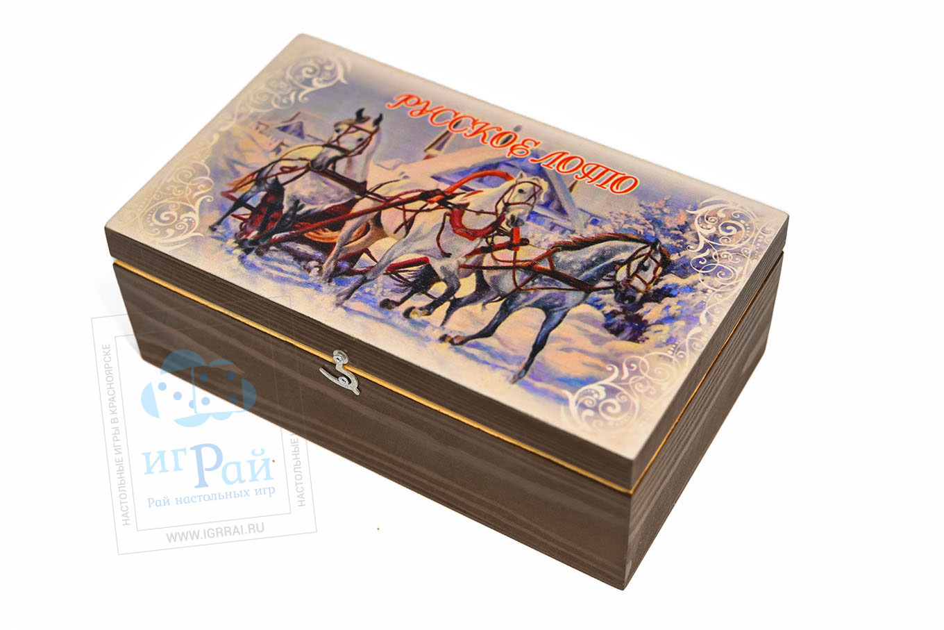 Все знают русское лото, это популярная игра для всей семьи, практически для любого возраста. В эти простую игру удобно играть во время семейного чаепития, или же в компании хороших друзей. Главная особенность этого лото, помимо качественных деревянных боченков, это подарочная коробочка из дерева с рисунком тройки лошадей.