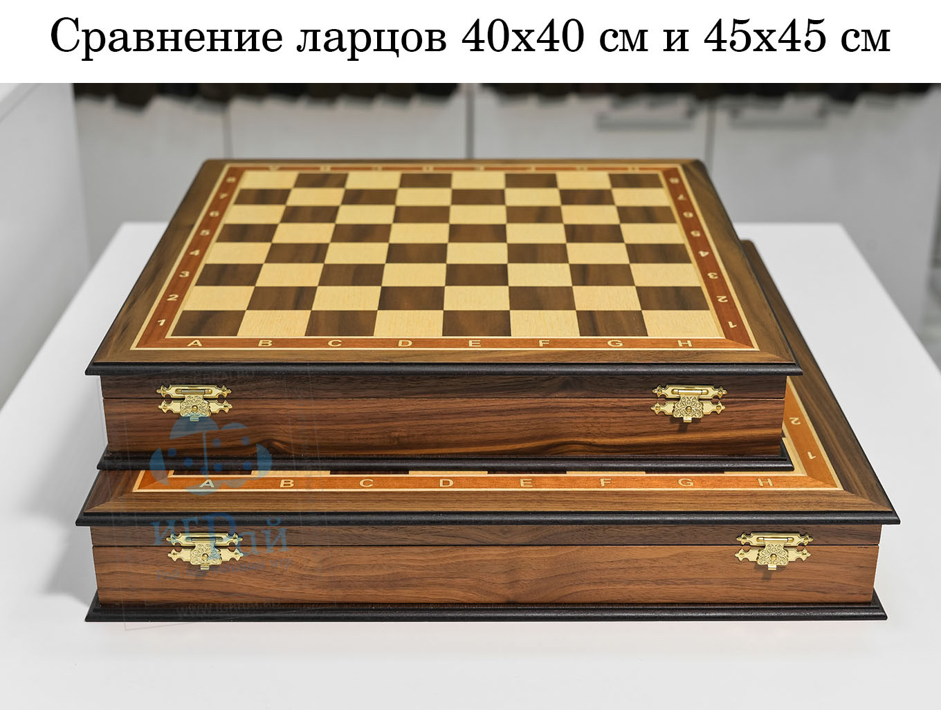 Удобный и компактный шахматный ларец 40х40 см. с отделением внутри для хранения фигур, обитый бархатом. Премиальный внешний вид и идеальное сочетание тёмных и светлых сортов деревьев. Отлично гармонирую между собой. Удобные замки, которые хорошо держат ларец в закрытом состоянии.