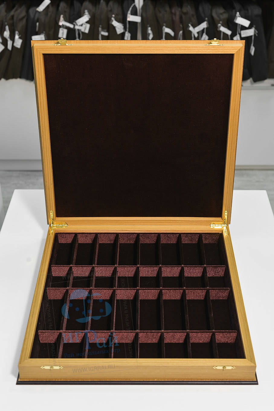 Хотите уникальную шахматную доску? Тогда вашему вниманию шахматный ларец размером 45х45 см. Элегантный и удобный, с ячейками под фигуры, каждая из которых обита бархатом. А снаружи, на откидывающейся крышке изображено игровое поле. Оно сделано по методу шпонирования. Всё выглядит качественно и чётко. Такой ларец отлично подойдёт для домашних игр или для определённых месть. Займёт не так уж много места, но станет отличным дополнением к интерьеру.