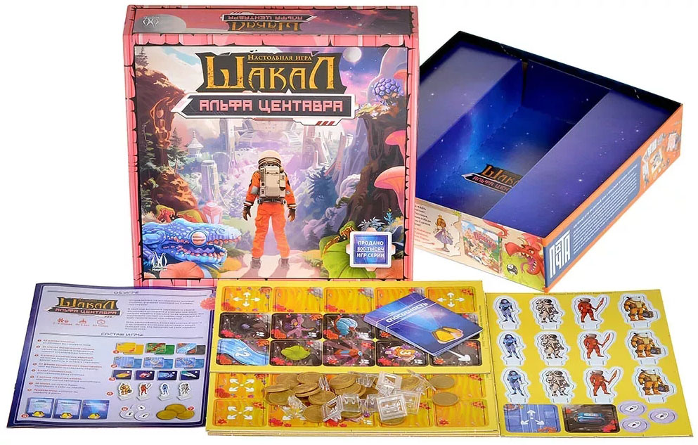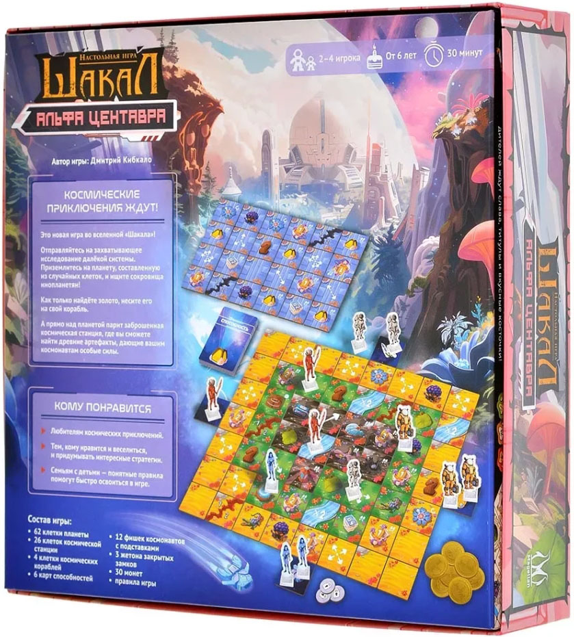 Игра "Шакал: Альфа Центавра" - это культовое продолжение в серии игр "Шакал". Теперь вы побываете на неизведанной планете в далёкой галактике. Возьмёте под контроль свой космический корабль и его экипаж. Исследуйте планету и найдите золото, а затем доставьте его на свой корабль. Победит тот, кто соберёт больше золота. Помимо новой карты в игре появилась таинственная станция, в которой вы сможете получить карточки с различными действиями. Они дадут вам преимущество и отлично разнообразят игру.