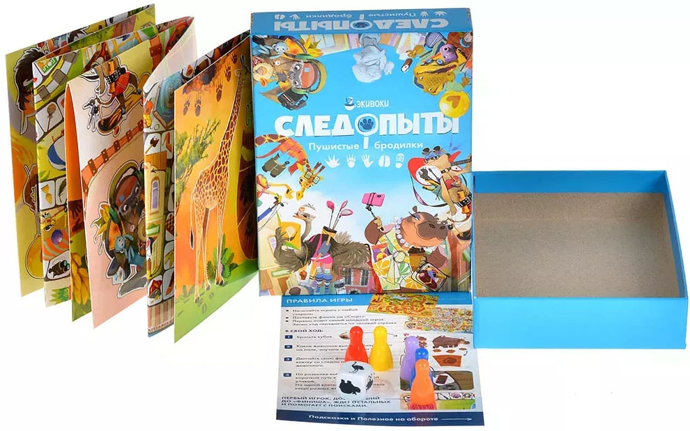 Разыскиваете хорошую и простую бродилку, в которую можно поиграть вместе с детьми, но обычные ходилки уже надоели? Компания Экивоки недавно выпустили новинку! «Следопыты» - обновленный вариант ходилки для всей семьи, легко помещается в небольшую коробку. Поле наполнено красочными иллюстрациями, а игровой процесс стал куда интереснее! Кидайте кубик с символами, и перемещайтесь на ближайшую клетку с совпадающим символом. Тот, кто дойдет первым до финиша – победил. А если нет желания соревноваться, сыграйте в кооперативный режим, в котором вам будет необходимо совместно искать улики – побеждайте вместе!