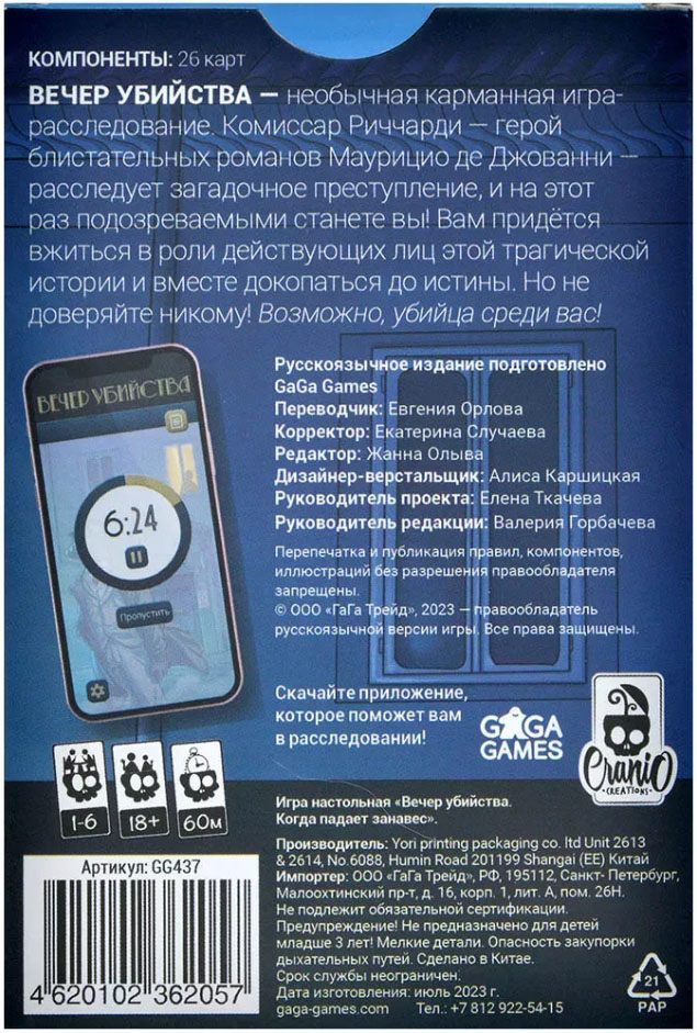 Маурицио де Джованни – настоящая рок-звезда в мире итальянских детективных произведений. Именно он стал автором для игры «Вечер убийств. Когда падает занавес». Игрокам предстоит разобраться в дерзком убийстве прямо в городском театре Неаполя. Воспользуйтесь специальным приложением для большего комфорта при расследовании. Но помните, время ограничено… Когда таймер досчитает до нуля, игра закончится!