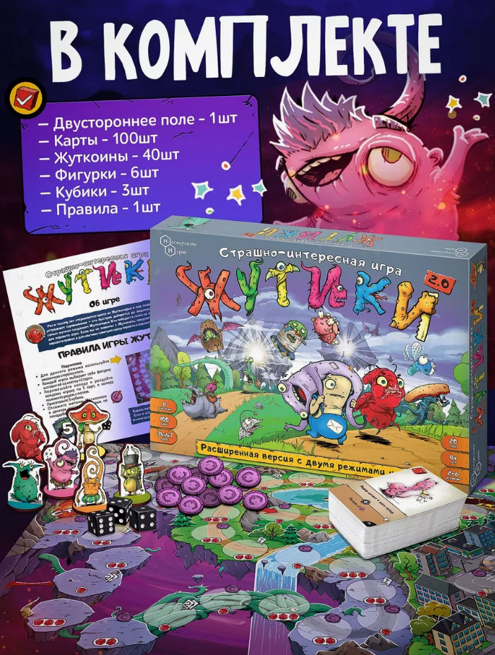 Настольная игра «Жутики» версия 2.0 подарит вам: два режима игры, двустороннее игровое поле и 100 новых различных карт, которые не повторяются, а также жуткоины. А количество игроков теперь доходит до 6 человек. Теперь гонка будет намного интереснее и сложнее.